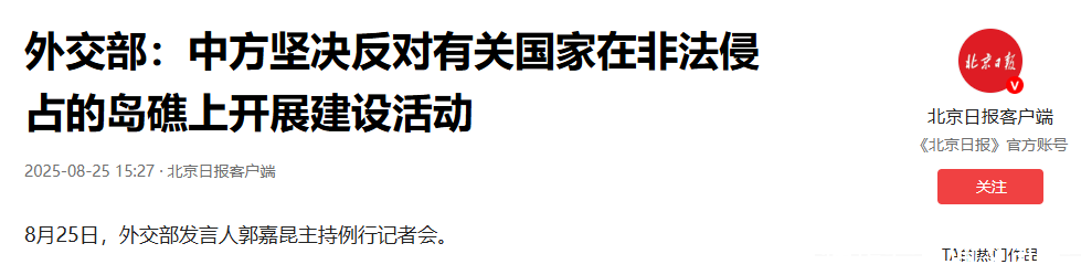 郭嘉昆指出,南沙群岛是中国固有领土,任何在非法侵占岛礁上的建设都是对中国主权的公然挑衅,中国将采取一切必要措施,坚决维护国家领土完整与海洋权益。